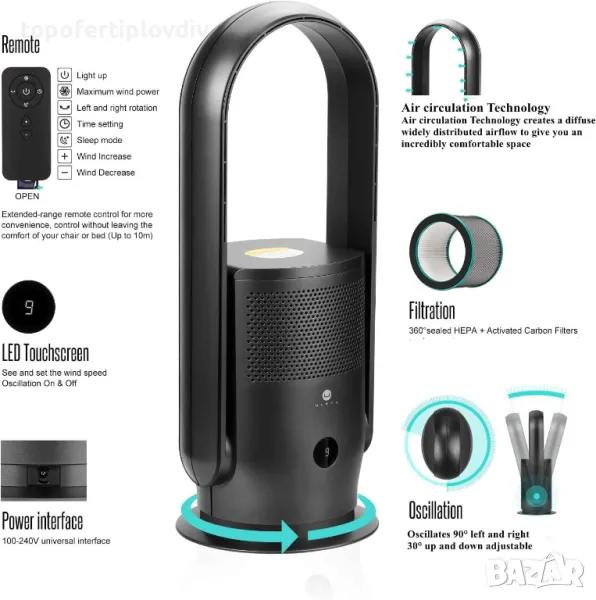 Мултифункционален вентилатор: 3 режима и 9 настройки на нивата, по-ниско ниво на шум, 8-часов таймер, регулируем отвор за въздух на 30°, 90° широк осцилиращ вентилатор с таймер за заспиване. Управление чрез LED сензорен екран или дистанционно управление.
