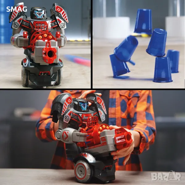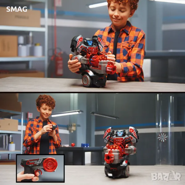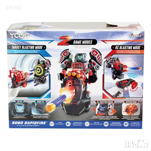 Новият Robo Rapidfire е 2-в-1 робот с дистанционно управление! Има LED лице и неговите динамични звукови ефекти! Изживяването на играта се подобрява от 2 режима на игра: 1. Робот стрелба по целта. Поставете стартера върху робота и получете върховен контрол върху посоката с най-иновативния контролер. Напредвайте във всички посоки, като изстрелвате стрели с едно натискане на бутон. 2. Контролер – пускова установка, насочена към движещ се робот. Поставете изстрелващото устройство върху контролера, за да изстреляте над 10 стрели, с голяма прецизност, към движещата се цел. Роботът, който държи целта, ще започне да се движи в произволни посоки, за да избегне стрелките. Иновацията на продукта предлага революционна игра както за деца, така и за родители!