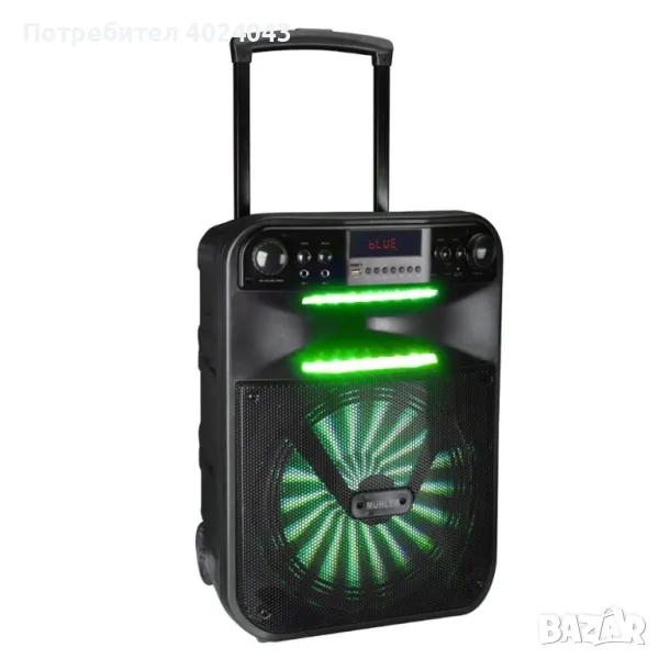 Вариант 1: 12" + 1" ;Вариант 2: 15" + 1";Функции: USB/TF слотове, FM радио, Bluetooth;Цветно осветление: Да;Дръжка и колела: Да;Батерия: 12V/7000mAh;Честотна характеристика: 45Hz-20kHz;Съпротивление: 4 ohm;Мощност: 80W;Аксесоари: Адаптор за зареждане, 2 бр. безжичен микрофон;Цвят: Черен;Нето тегло: 9.15kg;Бруто тегло: 11.3kg;Размери (ШхВхД): 380x596x310mm;Размери на опаковка (ШхВхД): 420x638x348mm.12 инча-цена 310,00лв 15 инача -цена335,00лв