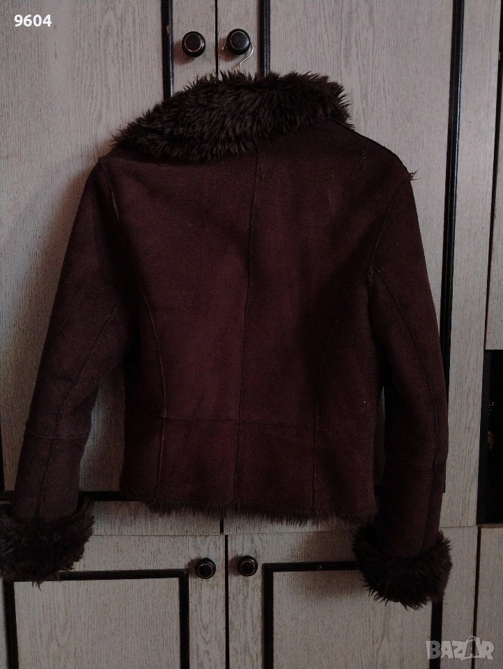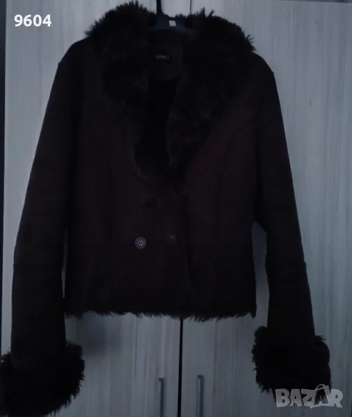 Дамско късо кожухче Mango. Цвят тъмно кафяв. Размер Л. Размери от рамо до рамо 42 см, подмишница 47 см, дължина 50 см, дължина ръкав 57 см . Обличано е 2 пъти. Малко ми е затова го продавам.