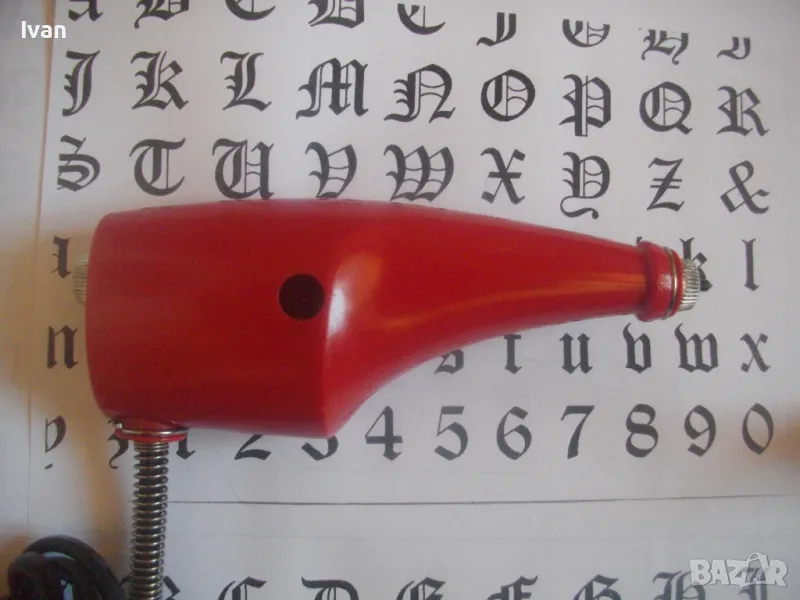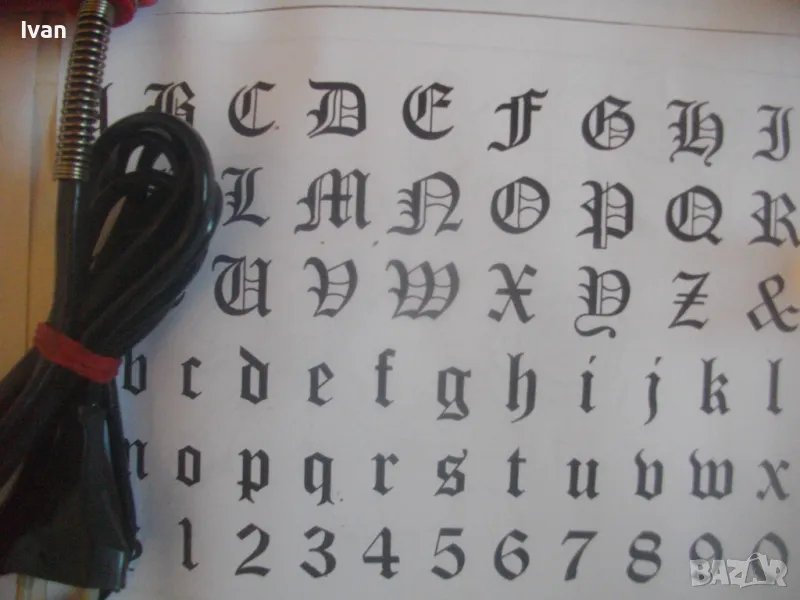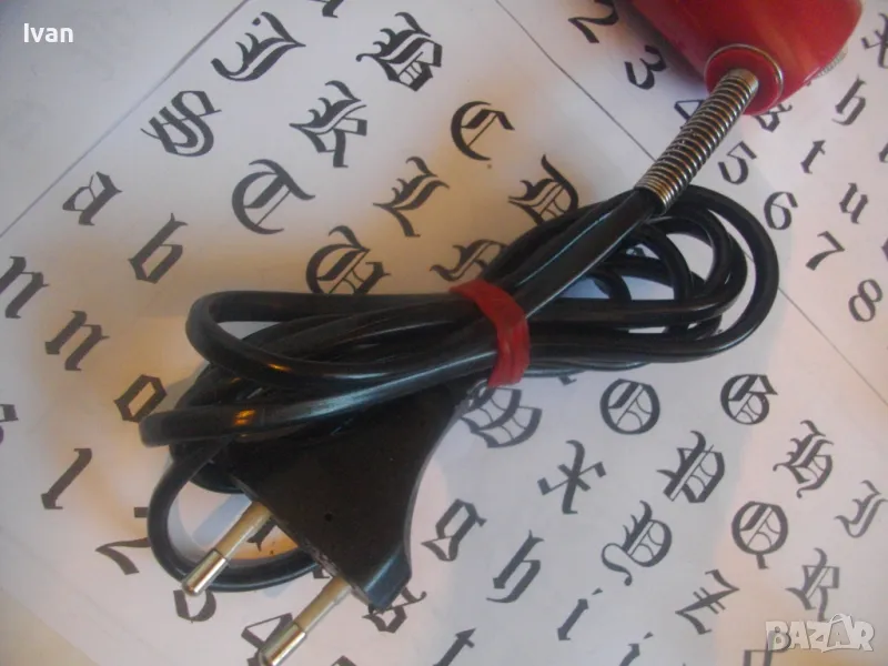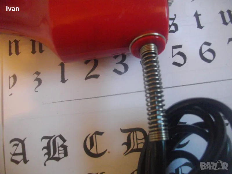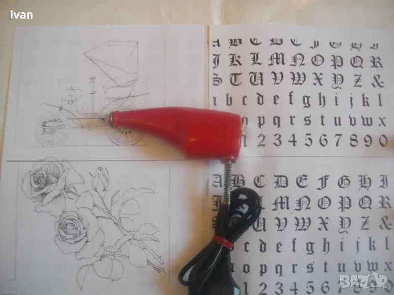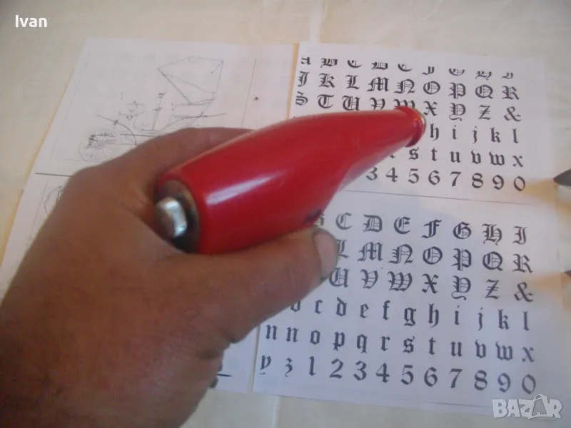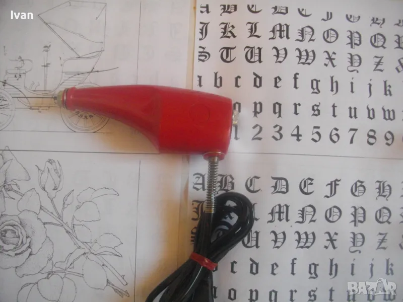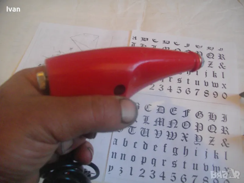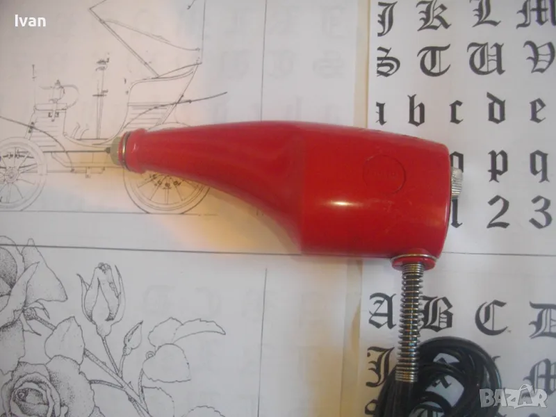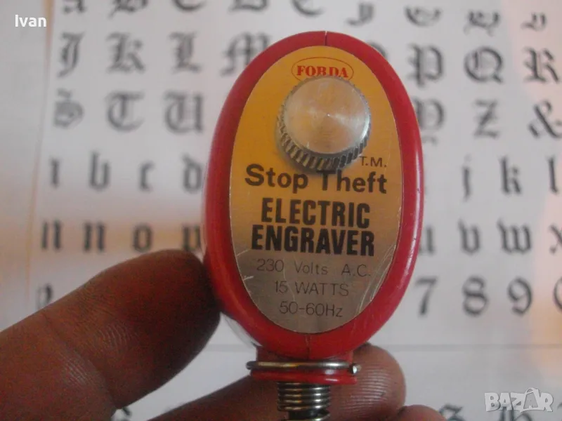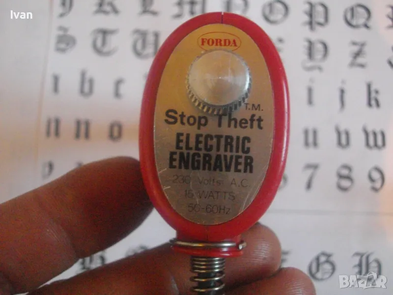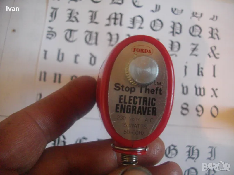 Цена на мини малка червена ел.гравьорка гравьор за гравиране - 99 лв. Английска, ползвана, с много запазен външен вид и задоволително работно съсотяние. Почти нова. Мини малка. Дължина 140 мм. Регулация скорост. Маркировки надписи: FORDA T.M. Electric Engraver - 230 Volts AC - 15 Watts - 50-60 Hz. Вградена приставка за гравиране, не се сменя.Към машината има шаблони с букви на латиница и скици графики за гравиране.
