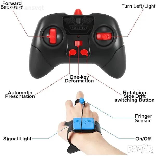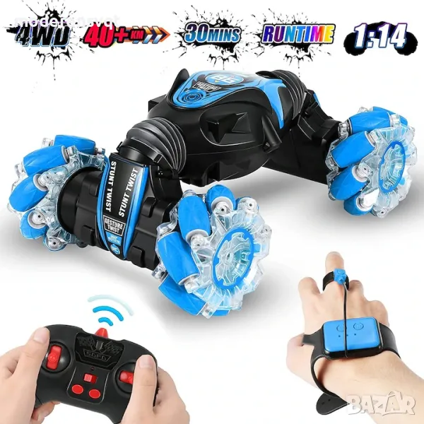 В комплекта има стандартно дистанционно с бутони и безжичен, сензорен часовник/дистанционно, който позволява само чрез движение на ръката да насочвате автомобила в желаната от вас посока. Благодарение на интуитивното управление чрез жестове за децата е много лесно да се научат да я управляват вместо да използват дистанционното "джойстик".