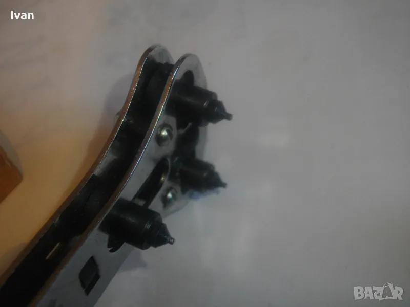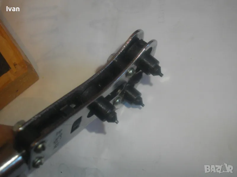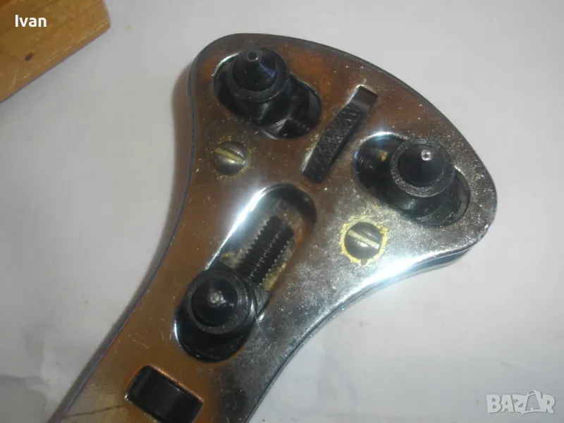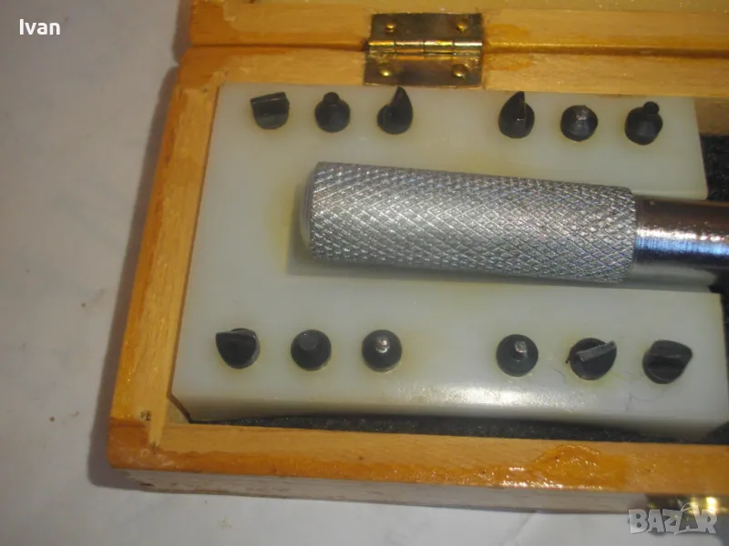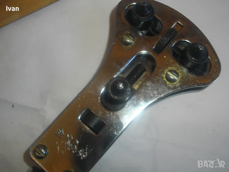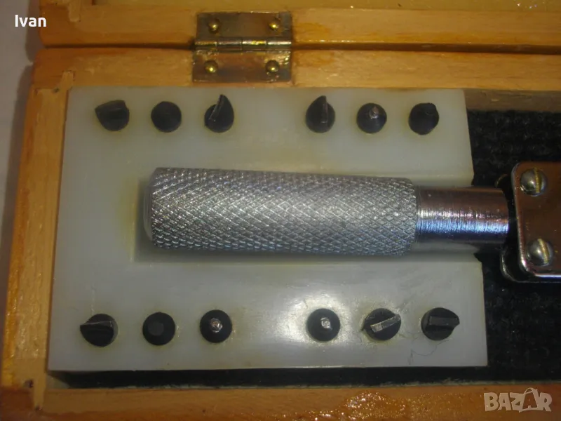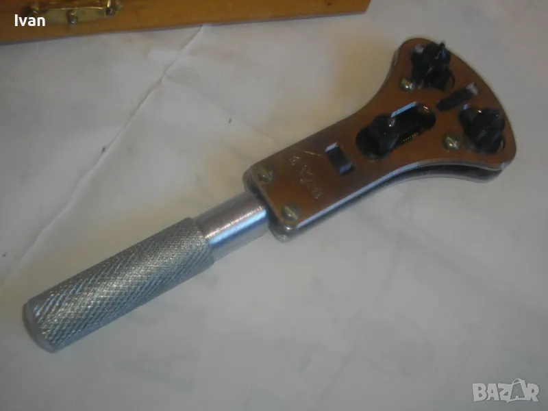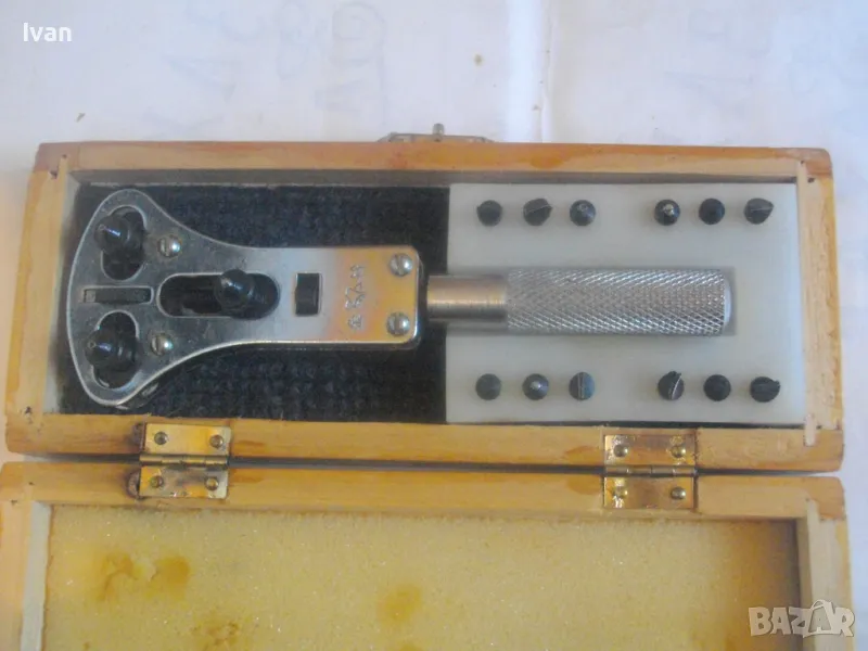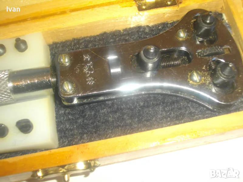 Цена на НОВ ръчен часовникарски инструмент ключ механичен - в оригиналната си дървена кутия - цена 159 лв. Производство не е упоменато, китайски или японски йероглифи върху кутията с лого на марка камбана. Период на производство - 80-те - 90-те години на 20-ти век. Комплекта е съвсем нов, ключ регулируем с дължина 145 мм, 12 броя различни приставки за него от масивна закалена стомана, дървена луксозна кутия с подплата вътре, метална копчалка и с размери 180 х 75 х 35 мм.