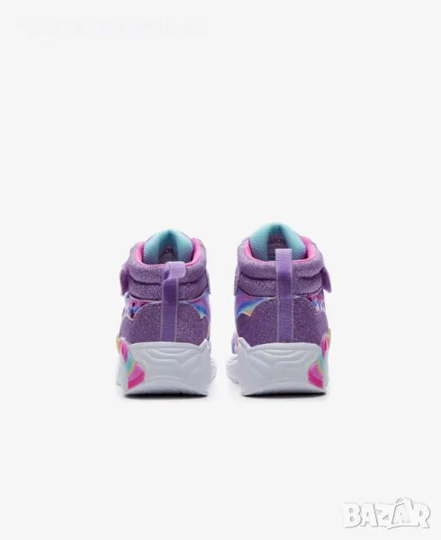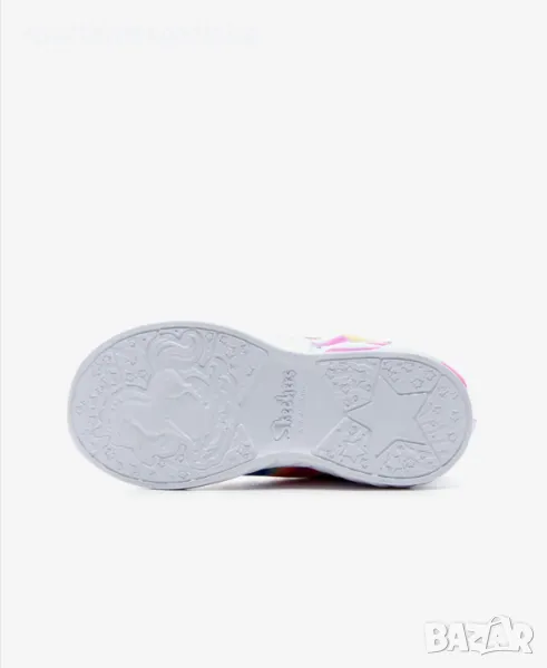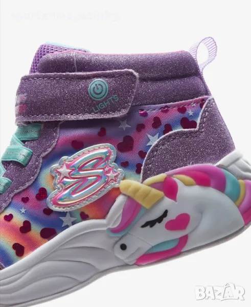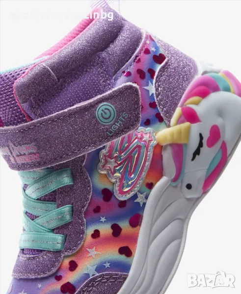 Стабилна конструкция от еко кожа със синтетични наслагвания, блестящи детайли и щамповани сърца за невероятен ефект, по-голяма издръжливост и подкрепа. Подсилването в предната част около пръстите защитава най-чувствителната зона от удари и износвания. Допълнително подсилена задна част. Ластични връзки и велкро лента в горната част за лесно обуване и събуване. Нисък профил за по-голяма свобода при движение. Надпис Skechers Unicorn Dreams върху велкро лентата и отличително лого встрани. Изключително цветен и искрящ дизайн с блестящи декорации на предните и страничните панели, сърца върху тях и блясък на велкро закопчаването, специалният акцент обаче е светещата форма на еднорог на подметката, която се включва и изключва с бутон на велкро лентата. Вътрешната част е покрита с текстилна облицовка. Skechers Air-Cooled Memory Foam - дишаща стелка с изключително високо ниво на омекотяване. Междинната подметка предлага отлични омекотяващи свойства и анатомична опора за краката, тя абсорбира силата на удара при неравни повърхности. Гъвкава гумена подметка за перфектно сцепление.