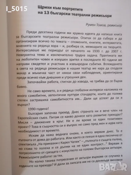 Българският театрален режисьор с дългогодишна практика Румен Томов е автор и съставител на тази така актуална книга, „Енигмата режисьор“. Тук той събира 13 публикувани в периодични или непериодични издания статии, очерци, интервюта на изявени и всепризнати негови колеги – българските творци от нашето съвремие Боян Дановски,