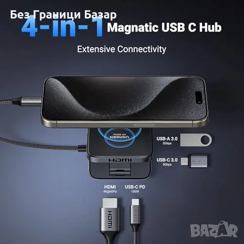 Нов Магнитен USB-C Hub UGREEN с HDMI, USB-A, 100W PD, Компактен и Сгъваем