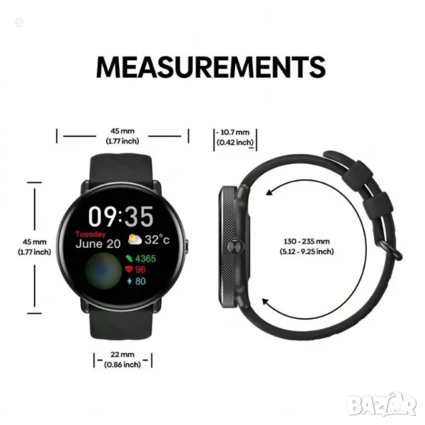 -Температура на работа:От -40° до 55°C (температури под -40°C могат да повлияят на живота на батерията и работата на смарт часовника)