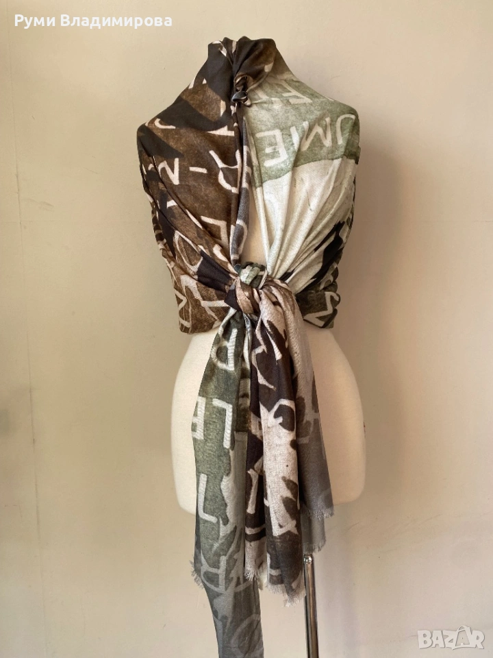 Шал от 100% модал в тютюнево и петролено зелено с надпис Monte Carlo и други, голям размер 202 Х 92 см, фина и мека материя, липсва етикет за марка, нов, доставка с Еконт, цена 15€.