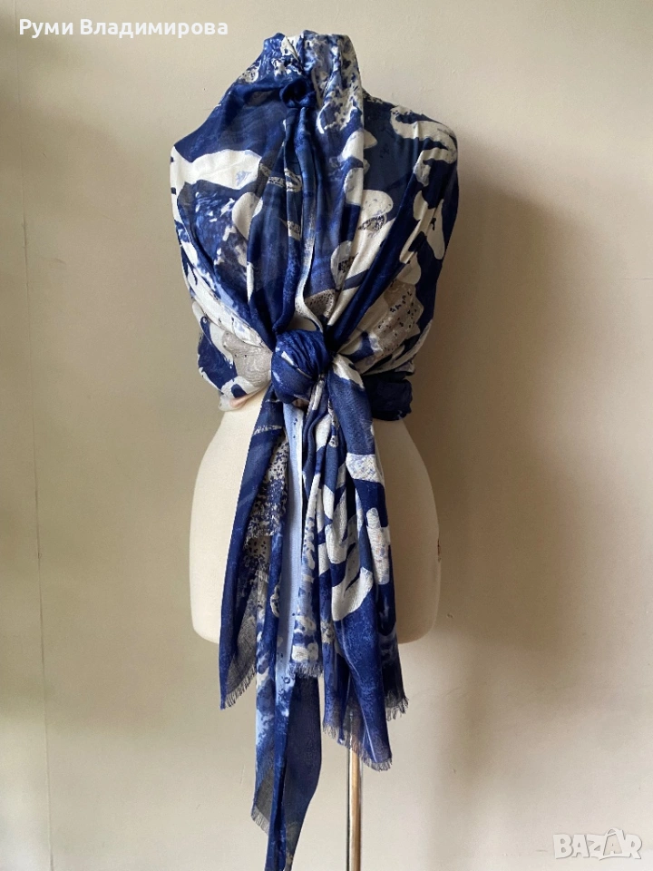 Шал на цветя Desigual, на големи, изпълнени с цвят графични цветя, десен едновременно с това е и на малки черни точки, етикет за материята липсва, но има етикета на марката и и лого по шала, голям размер, може да се използва за летен аксесоар, доставка с Еконт, цена 15€.
