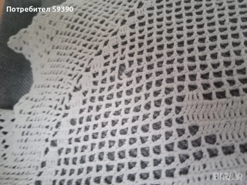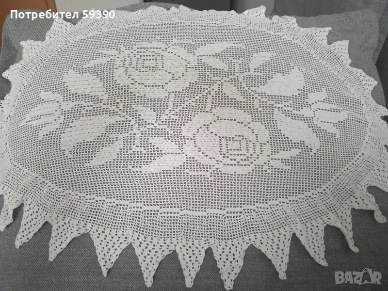 Плетена покривка с рози,има дефекти. Прокъсване на две места ,едното го заших с обикновен конец(за съжаление не мога да плета). Това е покупка , която не огледах добре. Размер:46/68 см.Изпрана,без петна. За София може на лично предаване.