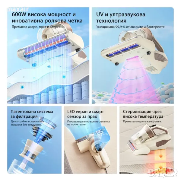 Само за 5 секунди работната температурата достига 55℃, като по този начин прониква в дълбочина в дивани и матраци. Бързо унищожава акарите и бактериите, за да можете да се насладите на комфорт дори във влажни дни.