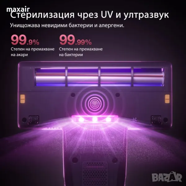 Благодарение на иновативната технология за UV стерилизация, BX8 елиминира прах, акари и бактерии в дълбочина. Прахосмукачката излъчва ултравиолетови вълни с дължина от 253 nm, които унищожават 99,99% от праховите акари.