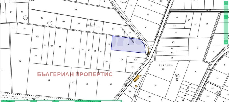 Общата площ на имота е 21 451 кв.м. със статут земеделска земя, категория 4, НТП Нива.