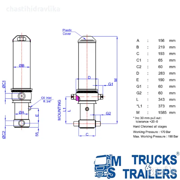 За монтирането на този Хидравличен цилиндър са необходими допълнителни елементи - горен комплект стойки (47000024) и долен комплект стойки (47000121), които се заплащат отделно. Цена при запитване
