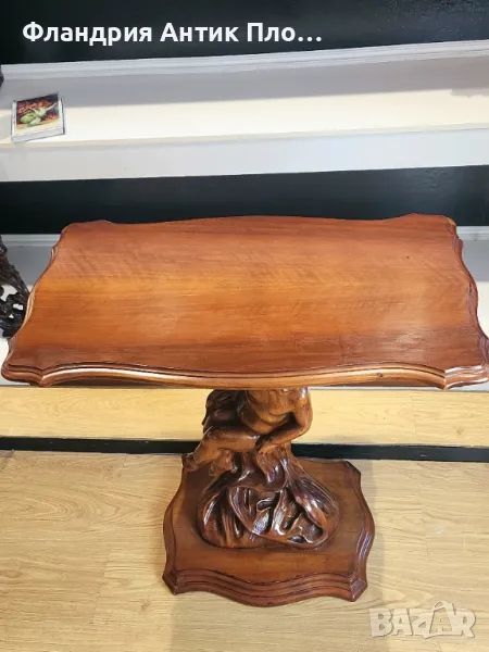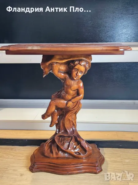 Старинна конзолна маса от орехово дърво, която съчетава изящество и практичност. С правоъгълен плот и въртящ се механизъм, тя може лесно да се адаптира за различни нужди. Основата й е истинско произведение на изкуството – елегантно оформена като скулптура на херувимче, което добавя романтика и очарование. Тази маса е идеален акцент за интериори с винтидж или класически стил, привличащ погледа със своя уникален дизайн и детайли.