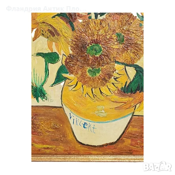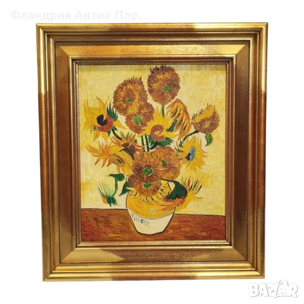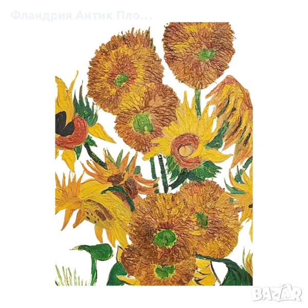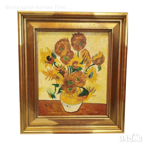 Тази възхитителна репродукция /масло/платно/ на "Слънчогледи" от Винсент ван Гог внася топлина и неподправена красота във всяко пространство. С богати, златисти тонове и емблематичния експресивен стил на художника, картината улавя живота и енергията на тези слънчеви цветя. Създадена с внимание към детайлите и яркостта на оригинала, тази творба е подходящо допълнение за любителите на класическото изкуство и уникален акцент за дома или офиса. Вдъхновяващ избор за всяко кътче, което се нуждае от свежест и артистичен почерк.