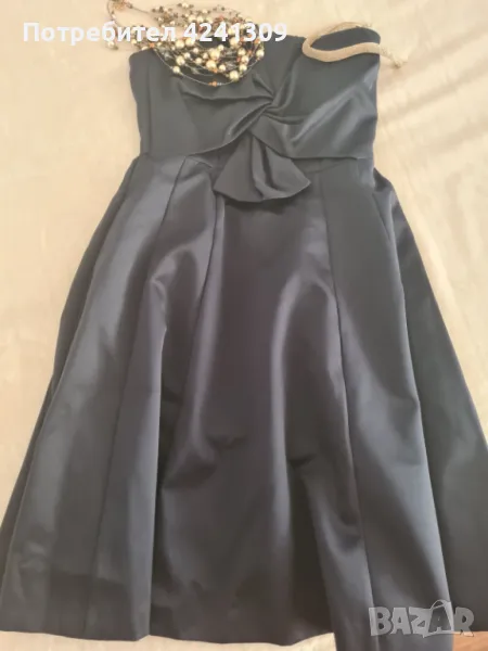 Изключително нежна и елегантна рокля H&M, в тъмно син цвят, без презрамки, с вътрешна силиконова лента, от плътен сатен. Размер 36.
