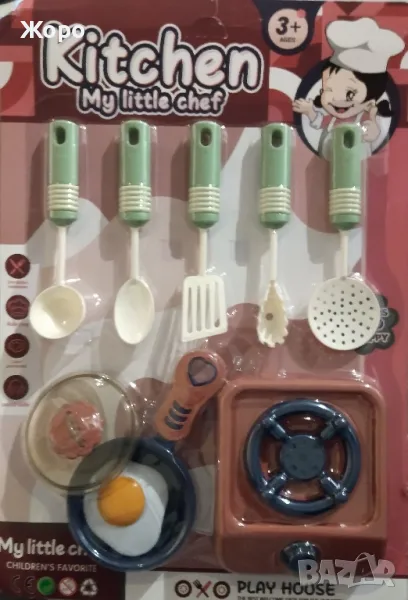 Детски кухненски комплект, който ще се хареса на всяка малка домакиня. Той идва в приятни нежни цветове и съдържа най-необходимото за кукленската кухня с котлон и тиган за пържени на яйца . Комплектът е подходящ за самостоятелни забавления или весели игри с приятели.