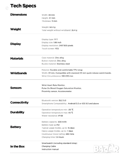 -Температура на работа:От -20° до 45°C (температури под -20°C могат да повлияят на живота на батерията и работата на смарт часовника)
