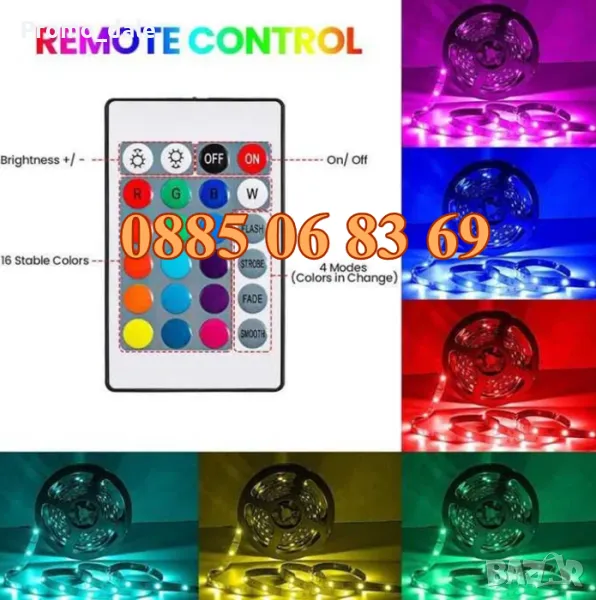 ЛЕД светодиодна лента с дистанционно. Лесна за монтаж и демонтаж! Напълно самозалепваща се фиксира лесно към гладки повърхности. Просто отлепяте стикера и залепвате RGB LED лентата.