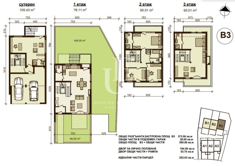 Разпределение: къщата е реализирана на четири етажа, от които приземен етаж и три жилищни етажа, както следва: