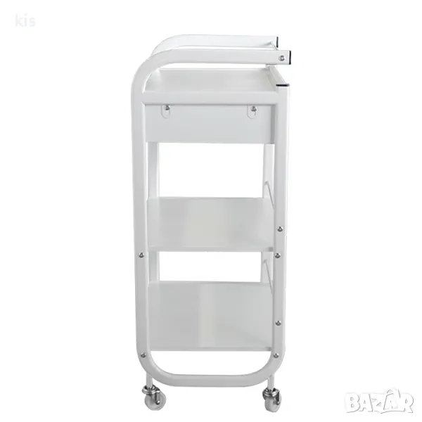 Стабилна и функционална козметична количка с три рафта, изработени от ПДЧ и 1 чекмедже с дръжка, предназначена за съхранение на Вашите работни материали и консумативи. Конструкцията е от метал, който гарантира здравината на модела. Количката е снабдена с пластмасови колела за мобилна работа и дръжки от двете страни за лесно преместване. Дизайнът на количката за козметика е изчистен и позволява съчетаването с всякакво оборудване. Подходяща е за ползване в козметични салони, спа и масажни студиа, лекарски и зъболекарски кабинети.