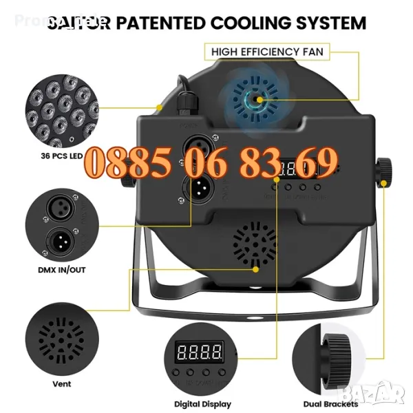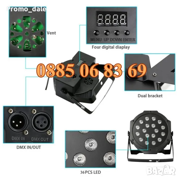 - Светлинни режими: автоматичен, под такта на музиката, DMX512, Master-Slave.