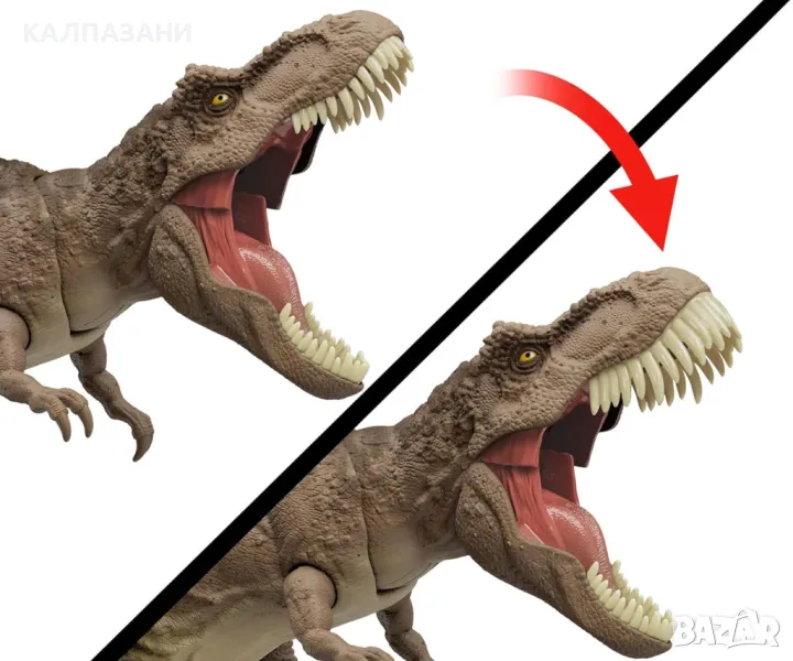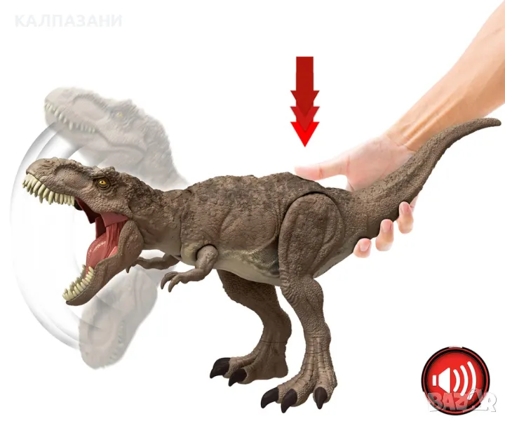 Тази всеобхватна атака на тиранозавър Рекс идва с най-емблематичните видове от всички видове атака и „еволюира за битка“. Буйната атака на тази екшън фигура е драматичен удар нагоре и надолу с врата, заедно с рев. Колкото по-бързо се натиска бутонът, толкова по-големи са ревовете! Този Т-Рекс също е „еволюирал за битка“ със зъби, които стават почти 2 пъти по-големи! Сканирайте скрития код за проследяване в безплатното приложение за игра на Jurassic World Play със съвместимо смарт устройство (Android или iOS, не е включено), за да отключите цифрова версия на динозавъра и достъп до невероятно забавни игри! Цветовете и декорациите могат да варират.