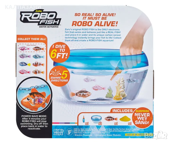 За да я активирате, просто я извадете от опаковката и я поставете във водата, рибата веднага ще побърза за своите рибешки задачи! Те са повече от живи - те са Robo Alive! Robo Fish се предлага с не мокър пясък, който може да бъде изваян, за да създадете свой собствен коралов риф! Извадете пясъка от купата и той незабавно отново изсъхва за повторна игра!