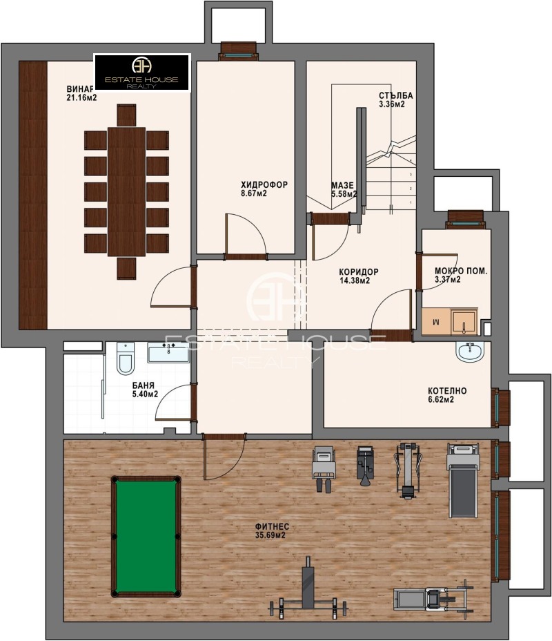 Допълнителни удобства: Винарна, фитнес, гараж за две коли и място за външно барбекю.