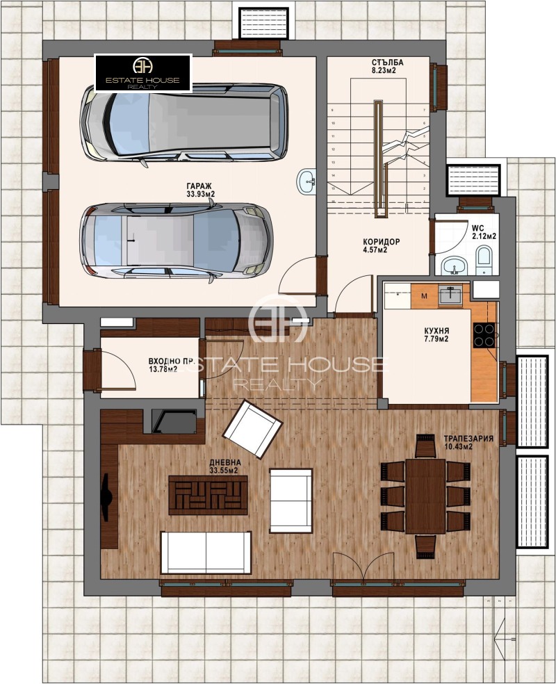 Партерен етаж: Просторен хол с кухненски бокс и трапезария, тоалетна за гости, технически помещения.
