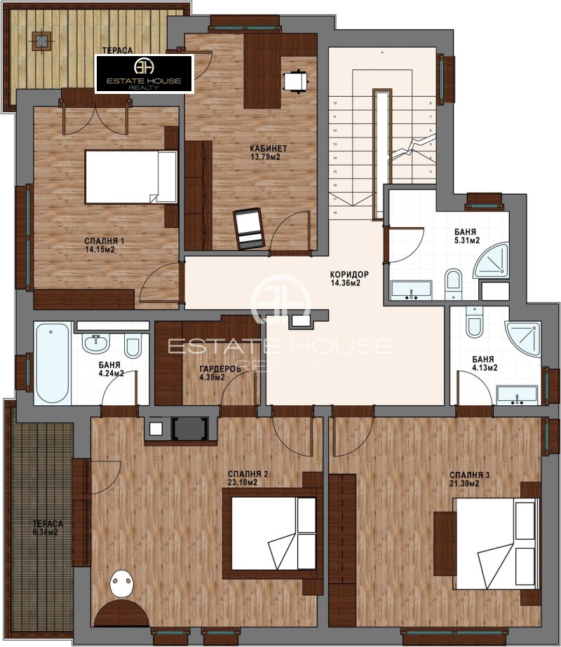 Първи етаж: 4 спални, 3 бани, вградени гардеробни стаи.