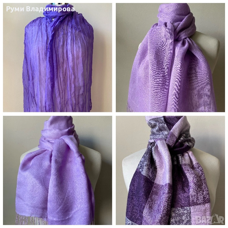 Светлолилав шал от 100 % коприна, люляково лилав шал, материя -тънка коприна фабрично намачкана на хармоника, като нов, отлично състояние, доставка с Еконт,