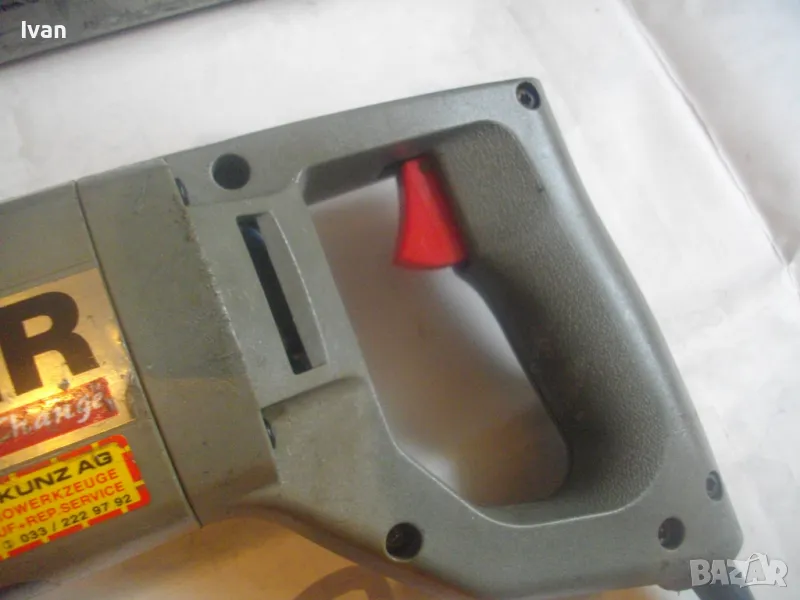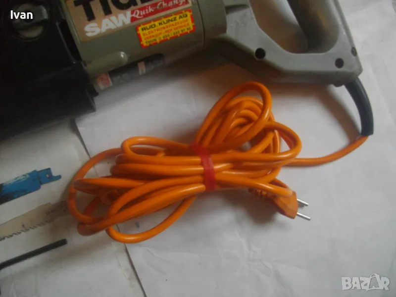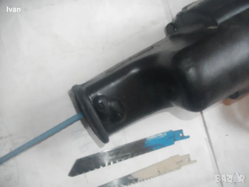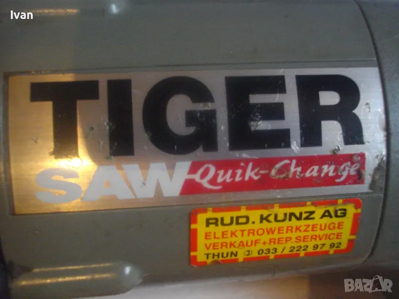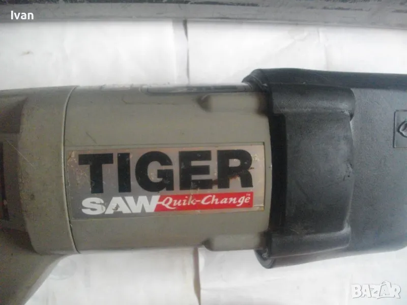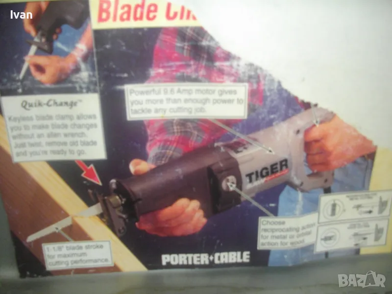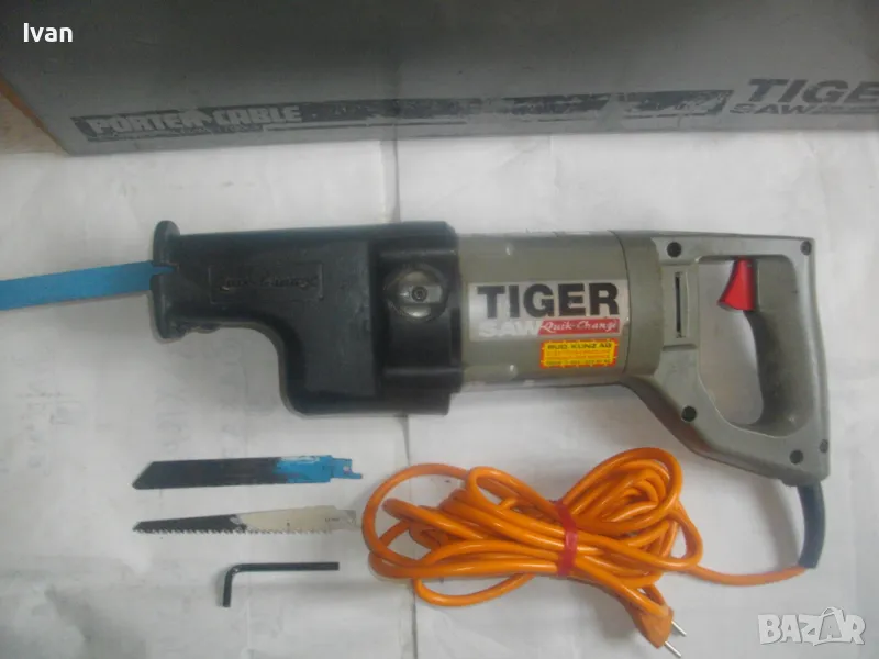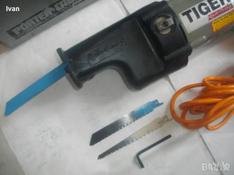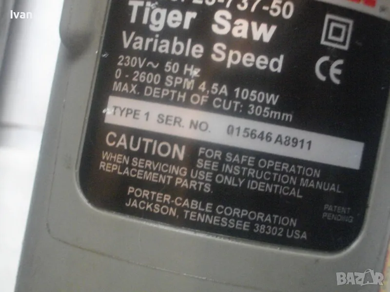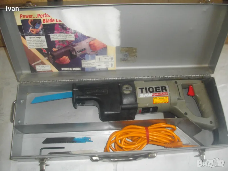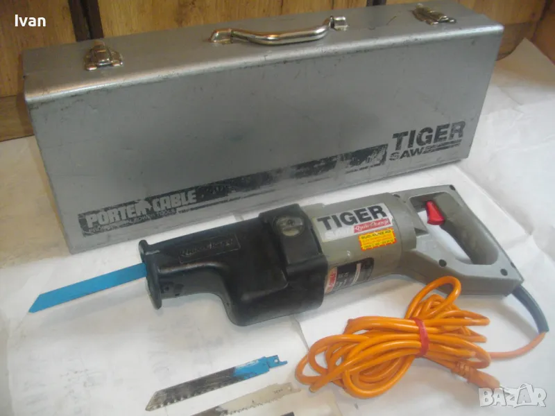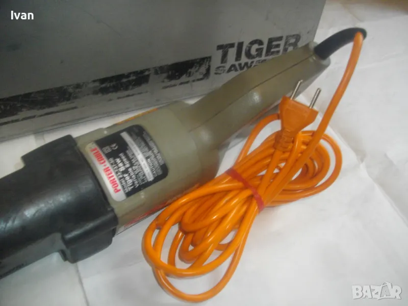 САЩ американски оригинален 1050 вата голям саблен трион реципрочен трион TIGER SAW USA в метален куфар - професионален - цена 399 лв. Професионална хипермощна 1050 ватова машина за рязане на дърво, метал и цветни метали. Оригинална американска. Маркировки - TIGER SAW - Porter Cable - PROFESSIONAL Power Tools - Tiger Saw Quick Change Porter Cable model 23 - 737 - 50. Tiger Saw Variable Speed. Porter Cable Corporation Jackson, Tennessee, USA. Max Cut - 305 mm. Мощност на мотора - 1050 вата, скорост 0-2600 об/мин. Защита 4,5 ампера, 50 херца, 230 волта. Машината няма никакво искрене от нива четки ротор, няма смущаващи вътрешни шумове. Липсва към нея предния метален ограничител на главата за ножа, което не пречи на работата. Налични 3 бр. ножове към нея - на WURTH - професионални оригинални - 2 за метал и 1 за дърво. Наличен 1 бр. ключ шестостен шестограм оригинален за смяна на ножовете на главата. Метален куфар оригинален с метални копчалки и горна и странична дръжки за носене, с вградени вътре места за компонентите. Тегло само на машината - 4,5 кг. Тегло с куфара - 8,0 кг.