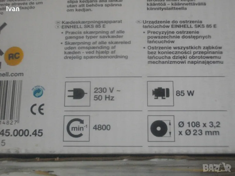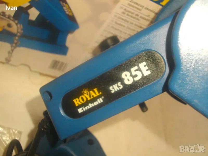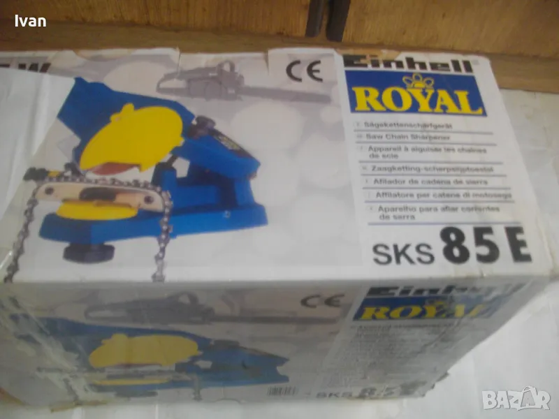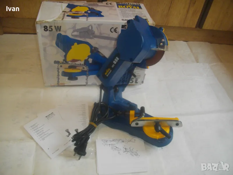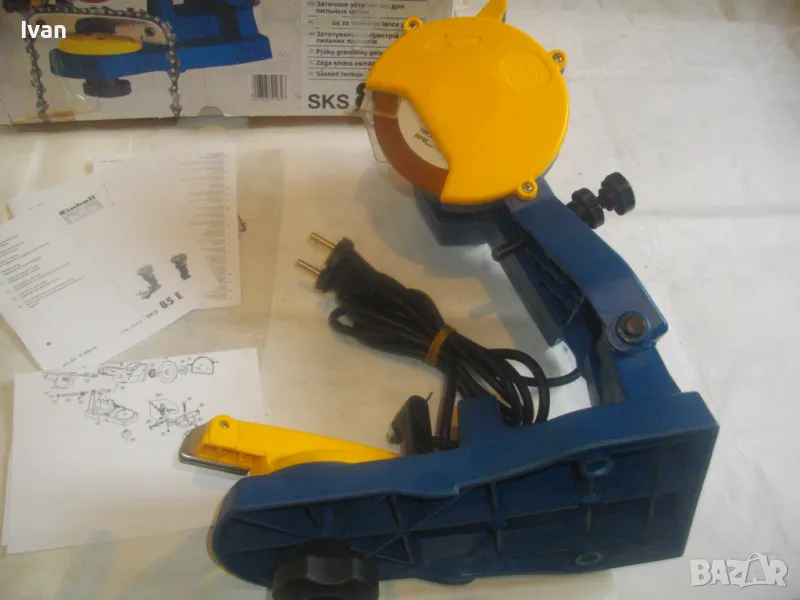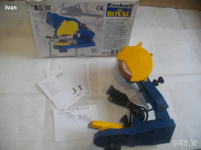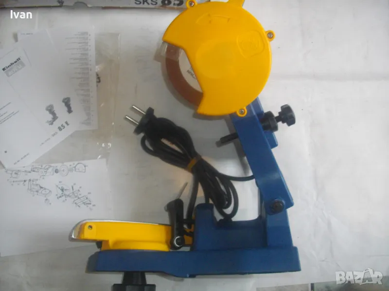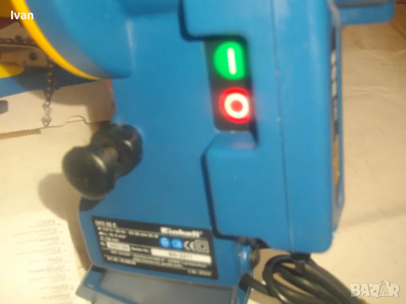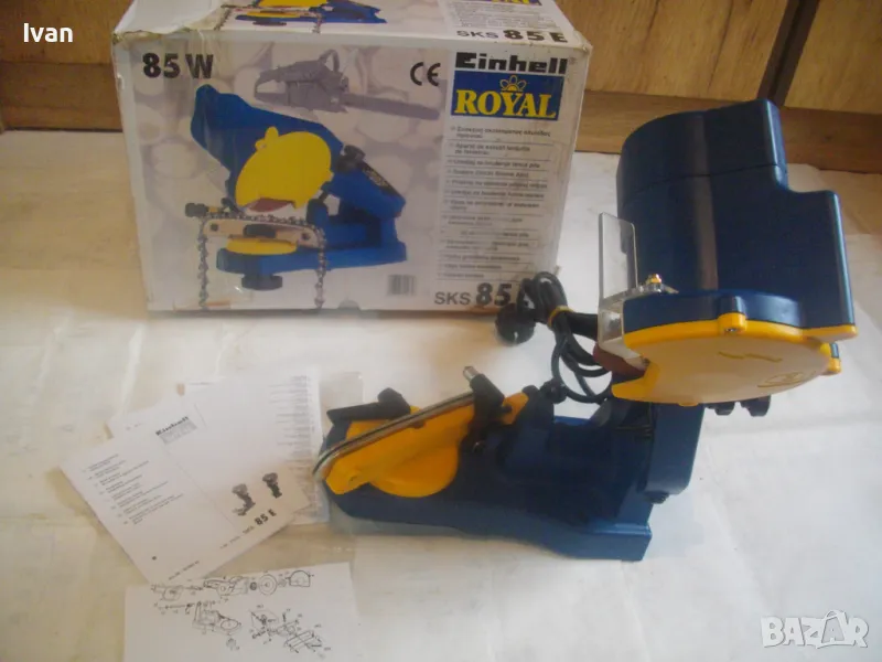 Нова електрическа машина за заточване на вериги на верижни триони - немска оригинална 2007 г. на EINHELL - 85 вата ф108 мм - с техн.документация и оригинален кашон - немска оригинална на марката. Съвсем нова машина, неизползвана и неупотребявана. Пробвана, в отлично работно състояние. Без забележки. Марка модел характерестики, производство - EINHELL Royal SKS 85 E - ISC GmbH. Немска оригинална 2007 г. Мощност 85 вата. Голямо време на работа с 1 пуск - S2 - 20 min. Регулируем ъгъл на заточване - 0-35 градуса. За заточващи дискове стандартни ф 108 х 3,2 х ф23 мм. Поставен нов оригинален заточващ диск. 2 пускови дигитални бутони с докосване. Височина на машината в изправено положение - 30 см. Налични скица и техническа документация на машината. Наличен оригиналния картонен кашон на машината. Тегло 3,0 кг.