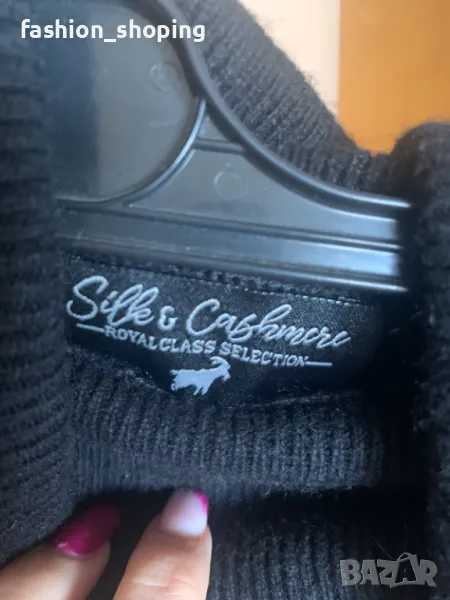 кашмир. Наситен черен цвят, пуловер тип поло. Стои свободно. Носи много топлина, уют и изолиря студа. На практика се комбинира с всякакви цветове.