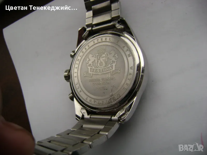Часовник Festina F16759.Работи абсолютно точно.Минерално стъкло.Датник.Всички малки стрелки са активни.Водоустойчив 5 АТМ.Диаметър на касата без коронката 44мм.Метална верижка.Дължина на верижката заедно с часовника 18,5см.Одраскан заден капак при смяна на батерията.Продава се в комплект с кутия.-140лв.