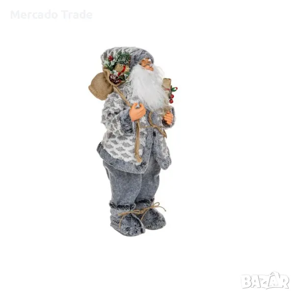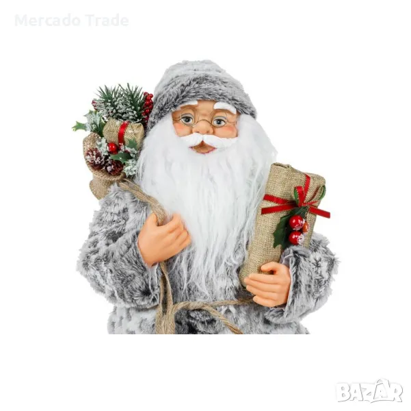 Коледна декоративна реалистична фигура на Дядо Коледа в сив костюм, камбана на шапка, чувал, пълен с подаръци и подаръчна опаковка със златна опаковка и имел.