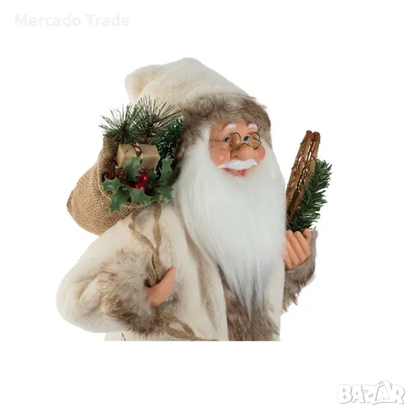 Коледна украса Реалистична фигура на Дядо Коледа в почти бял костюм от имитация на кожа, в едната ръка той държи чувал, пълен с подаръци, имел, елхови клонки и шишарка, в другата ръка държи снегоходки с елхови клонки и червени плодове и на главата си той има мръсно бяла и кафява шапка с изкуствена кожа и звънец.
