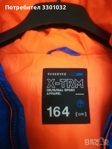 Елек със свободна,удължена кройка, 100% полиестер.С голяма качулка,не се сваля.Високо закопчаване с цип,олекотен пълнеж,хастар с изчистен дизайн.Свежи електрикови цветове - синьо и оранжево/портокалово/,унисекс.Отпред два джоба с ципове.Рамене - 42 см,гръдна обиколка ,под мишниците - 108 см,дължина през средата на гърба - 72 см.В долната част има прибиране с ластик и е 98 см в закопчан вариант.На етикета пише 164 см,детска номерация,но по размери е за слаби мъже и жени също.