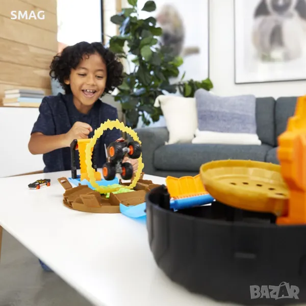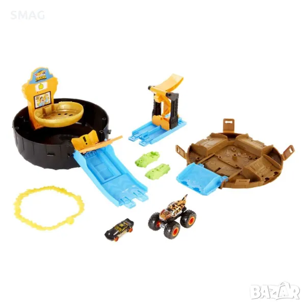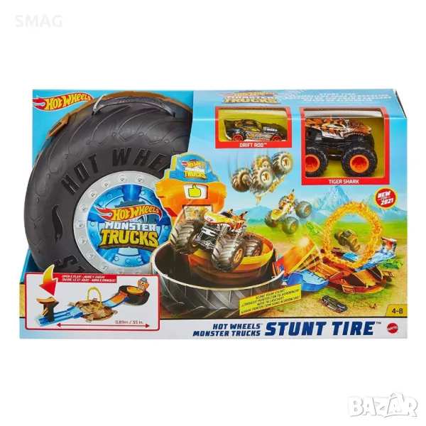 Hot Wheels® Monster Trucks Super Wheel се затваря и има дръжка за носене и се отваря, за да разкрие най-добрата арена за трикове за множество катастрофи и съхранение. Сглобеният комплект е дълъг 88 см и има невероятни характеристики. Гигантското колело включва камион чудовище Tiger Shark и кола Hot Wheels® в мащаб 1:64. Когато комплектът се отвори, той разкрива пускова установка за две коли или чудовищен камион, който може да излети и да премине през „огнен пръстен“. След това превозното средство трябва да кацне точно върху платформа, която ще го постави в кръга на победителя и ще оцени представянето на децата!