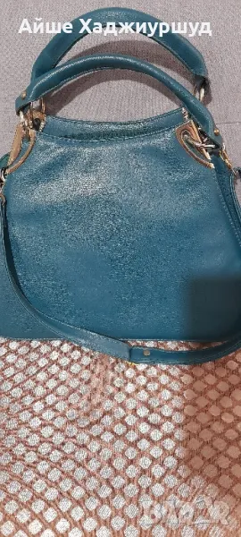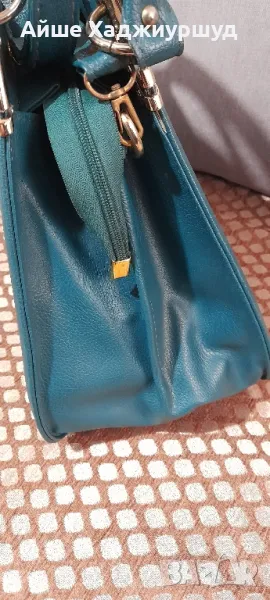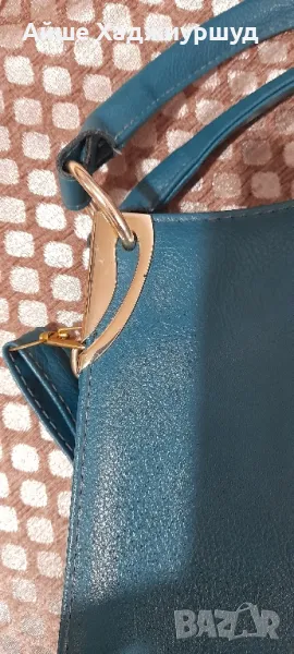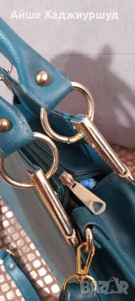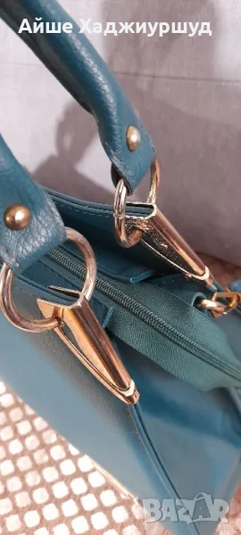 Дамска чанта,петролен цвят,с метални елементи около дръжките.С две отделения, с по един малък джоб,дълга регулируема дръжка,еко кожа.