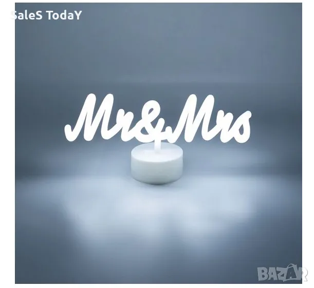 Настолна табела с бяла led неонова лампа "Mr&Mrs" върху основа Ø8.5см. С висок интензитет на светлината и дълъг живот. Работи с 3 AA батерии (не са включени) или с 1m USB кабел.