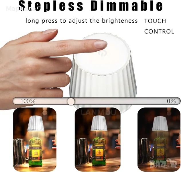 Лампа за бутилка вино с вградена топла бяла LED 3000K светлина, която може лесно и безкрайно да се регулира по отношение на яркостта чрез докосване на сензорния бутон в горната част.