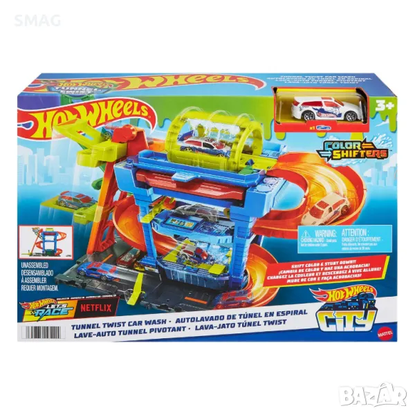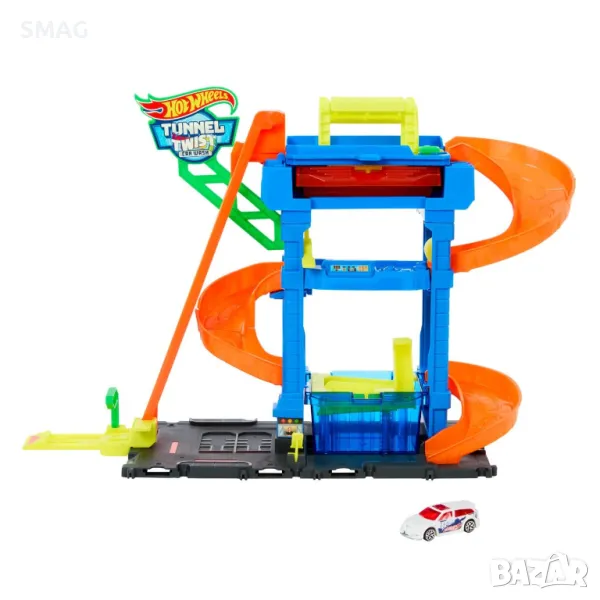 Новата автомивка Hot Wheels предлага ново игрово изживяване с функция за промяна на цвета и уникален тунел, който излива вода! Децата карат своята Светкавица до входа и я качват с асансьора до последния етаж. Карайте през въртящия се тунел за автомивка, измийте го в гореща вода и гледайте как дизайнът му се променя! Слезте надолу по рампата и влезте в цилиндъра, след това използвайте метлата. Накрая влезте в резервоара за студена вода, за да възстановите цветовете. Повторете отново и отново.
