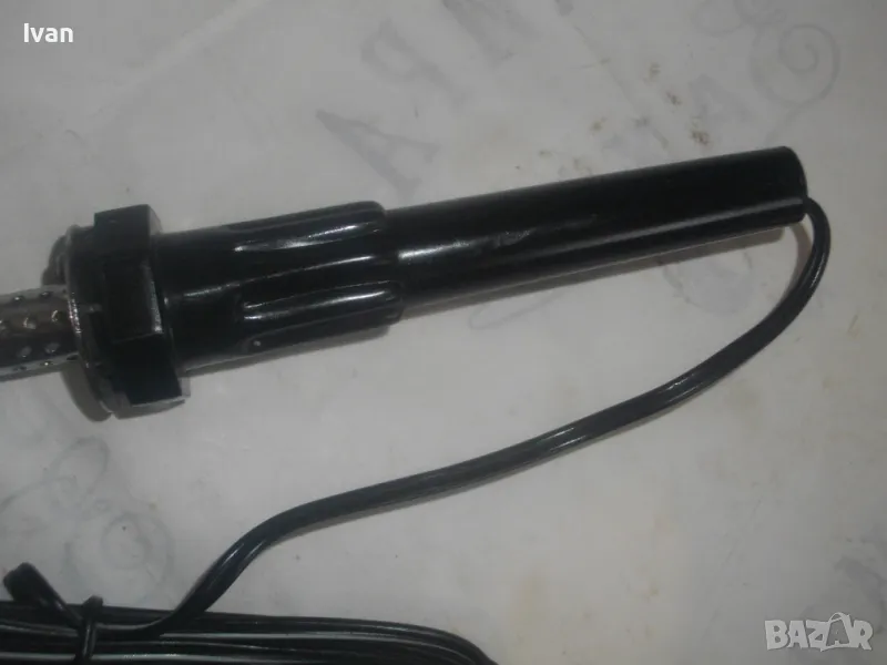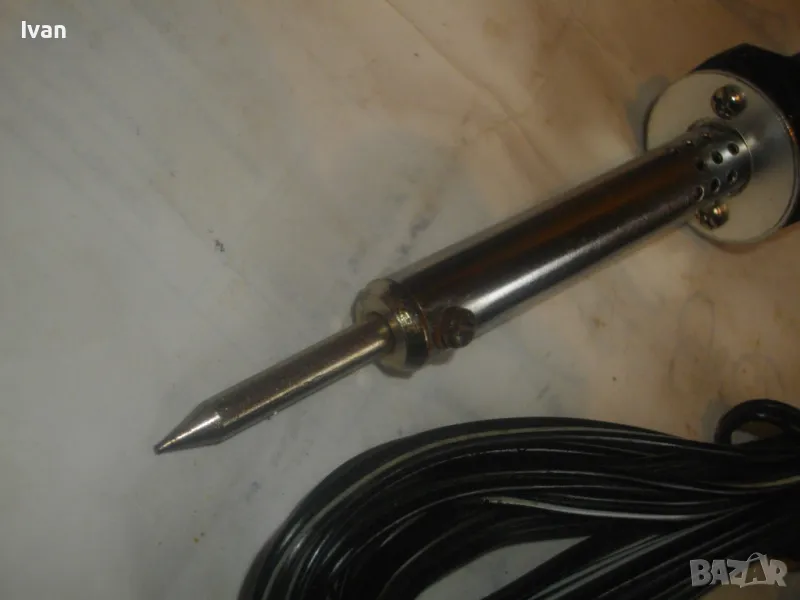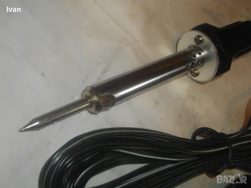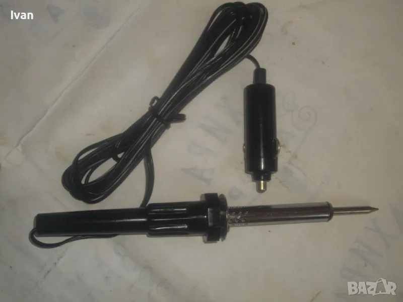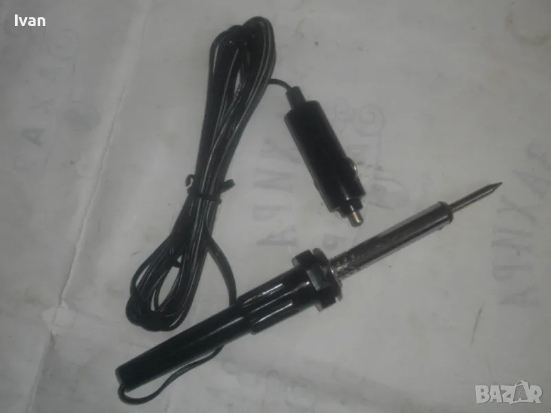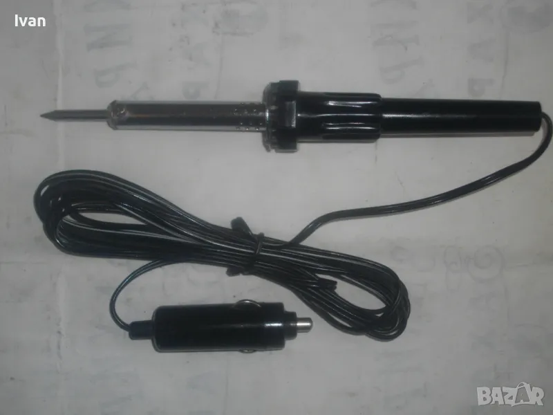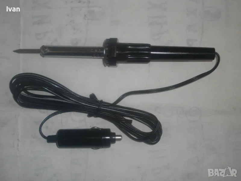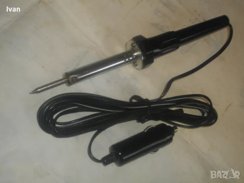 Нов 12 волтов реотанов поялник за скачване към запалка на превозно средство МПС - черен - цена 99 лв.Съвсем нов, неизползван и неупотребяван. Старо качество. Отлично състояние. Липсват маркировки. Бакелит дръжка, Дълга права 3 см човка с стър връх отпред за запояване. Кабел 3 м. Конзола букса за скачване км запалкка на МПС. Цялостна дължина на поялника 215 мм.