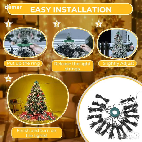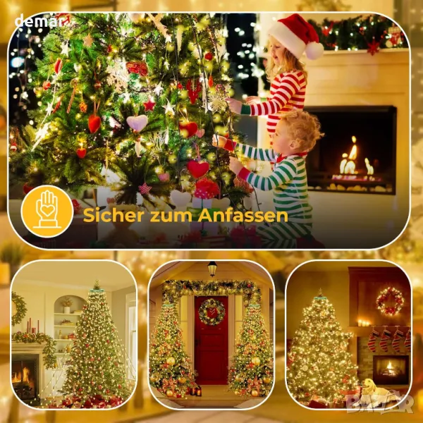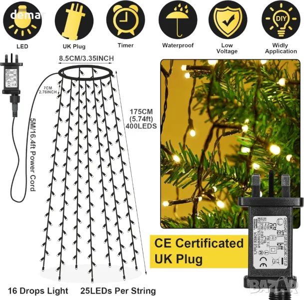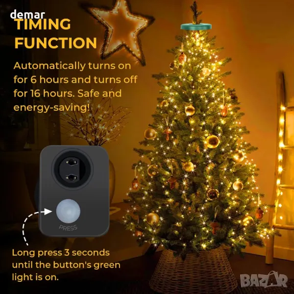 Лампи за коледно дърво Laybasic 1,75 м разполагат с 400 светодиода в 16 нишки с лесен за използване 5 м удължителен кабел, създавайки топла и очарователна атмосфера. Светлините предлагат 8 регулируеми режима с функция за памет, за да запазите последната си настройка, елиминирайки необходимостта от ежедневно нулиране. Вграденият таймер позволява автоматична 6-часова работа, спестявайки енергия. Проектирани с безопасна 31V система за ниско напрежение, те са подходящи за деца и домашни любимци, изработени от издръжливи материали за повторна употреба. Перфектни за вътрешна и външна употреба, тези универсални светлини подобряват коледните елхи, покривите и различни тържества като партита, сватби и др.