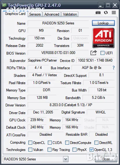 Продавам Видео карта ATi Radeon Sapphire R9250 Atlantis 128MB DDR 128bit AGP
