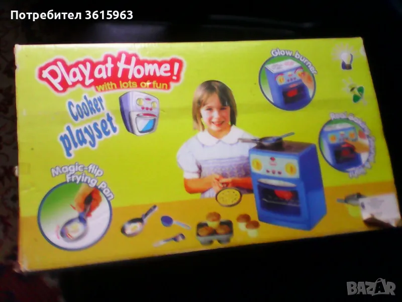 Работи с 3 обикновени батерии. Фурната свети и издава звуци, наподобяващи готвене.