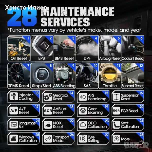 28 УСЛУГИ ЗА ПОДДРЪЖКА: функции, включително нулиране на маслото, нулиране на SAS, нулиране на EPB, нулиране на налягането в гумите, кодиране на инжектора, калибриране на SAS, обезвъздушаване на ABS, регенериране на DPF, съпоставяне на батерията, съпоставяне на дросела, съпоставяне на фарове, съпоставяне на скоростна кутия, съпоставяне против кражба, адаптиране на EGR , заучаване на зъбите и инициализация на шибедах. Покритите марки се актуализират непрекъснато.